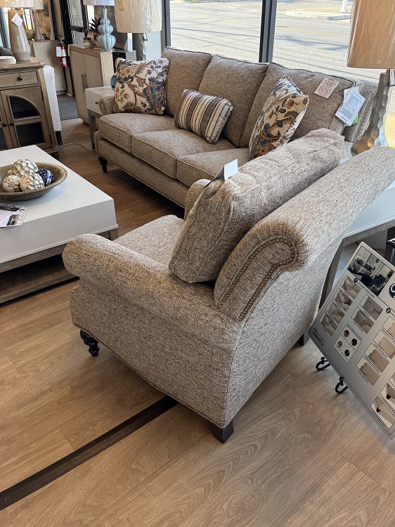 Classic traditional details and nail head trim accents are the things you’ll notice first on this gracefully finessed chair. It features a rollover back, cut-back rolled arms, and beautifully turned legs that offer a familiar heirloom touch. Attached box border back pillow. Optional nail finishes available. Also available is the matching ottoman. Also available without nail head trim as style 028310.