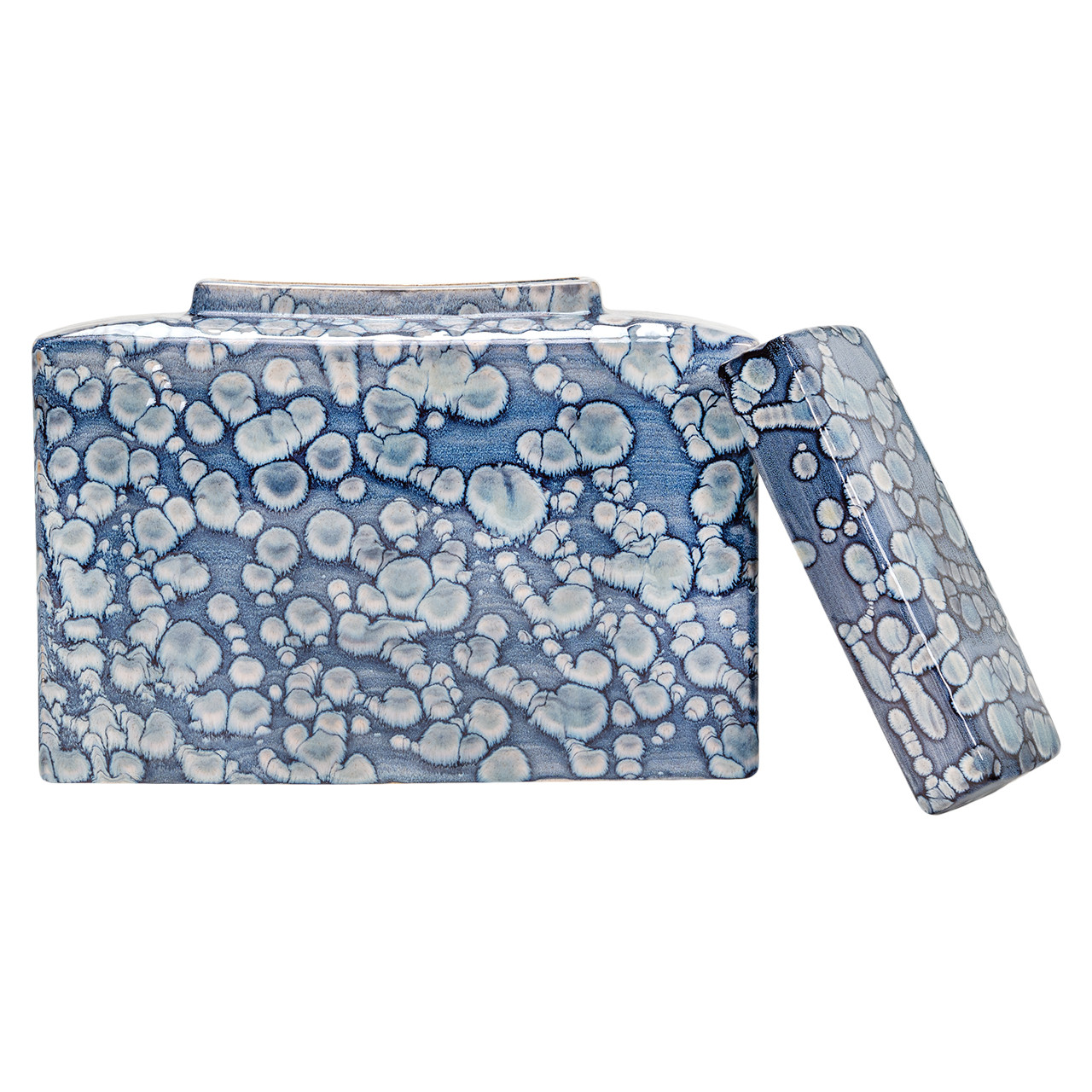 The Indari Short Jar is a rectangular stoneware accent measuring 16L x 5W x 12.5H, designed to add visual texture and tonal contrast to curated interior displays. Its elongated profile and structured silhouette are complemented by a rich blue glaze, detailed with soft white and gray speckling that gives the surface depth and movement. A removable lid adds function while completing the clean-lined form, making this piece both decorative and versatile. Ideal for styling on entryway consoles, bookshelves, or accent tables, the Indari Short Jar blends seamlessly with coastal, transitional, and contemporary decor themes. Its slim footprint allows it to nest effortlessly into layered vignettes, while its bold finish offers a focal point in modern retail or design-led environments.