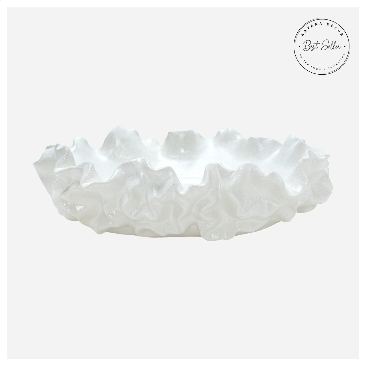 The Solino Large Centerpiece is a striking decorative bowl that embodies both coastal-inspired elegance and sculptural sophistication. Crafted from durable stoneware, this centerpiece features a soft white textured finish that evokes natural elements, lending a serene and timeless appeal to any space. Measuring approximately 19 inches in diameter and 5 inches in height, it boasts an organically flowing, freeform silhouette with gently undulating edges reminiscent of ocean waves. This fluid form creates subtle movement and visual interest, making the bowl as much a piece of art as it is a functional accent. Its matte finish offers a fresh, airy quality that seamlessly blends with minimalist interiors while also complementing more layered or traditional decor styles. Versatile in use, the Solino Large Centerpiece works beautifully as a dining table focal point, a sculptural accent on a console, or an elevated display piece for shelves. Its generous size provides presence without overwhelming, ensuring it becomes a refined focal point in any setting. The Solino Large Centerpiece is the perfect addition for those seeking understated coastal charm and artistic dimension in their home decor.