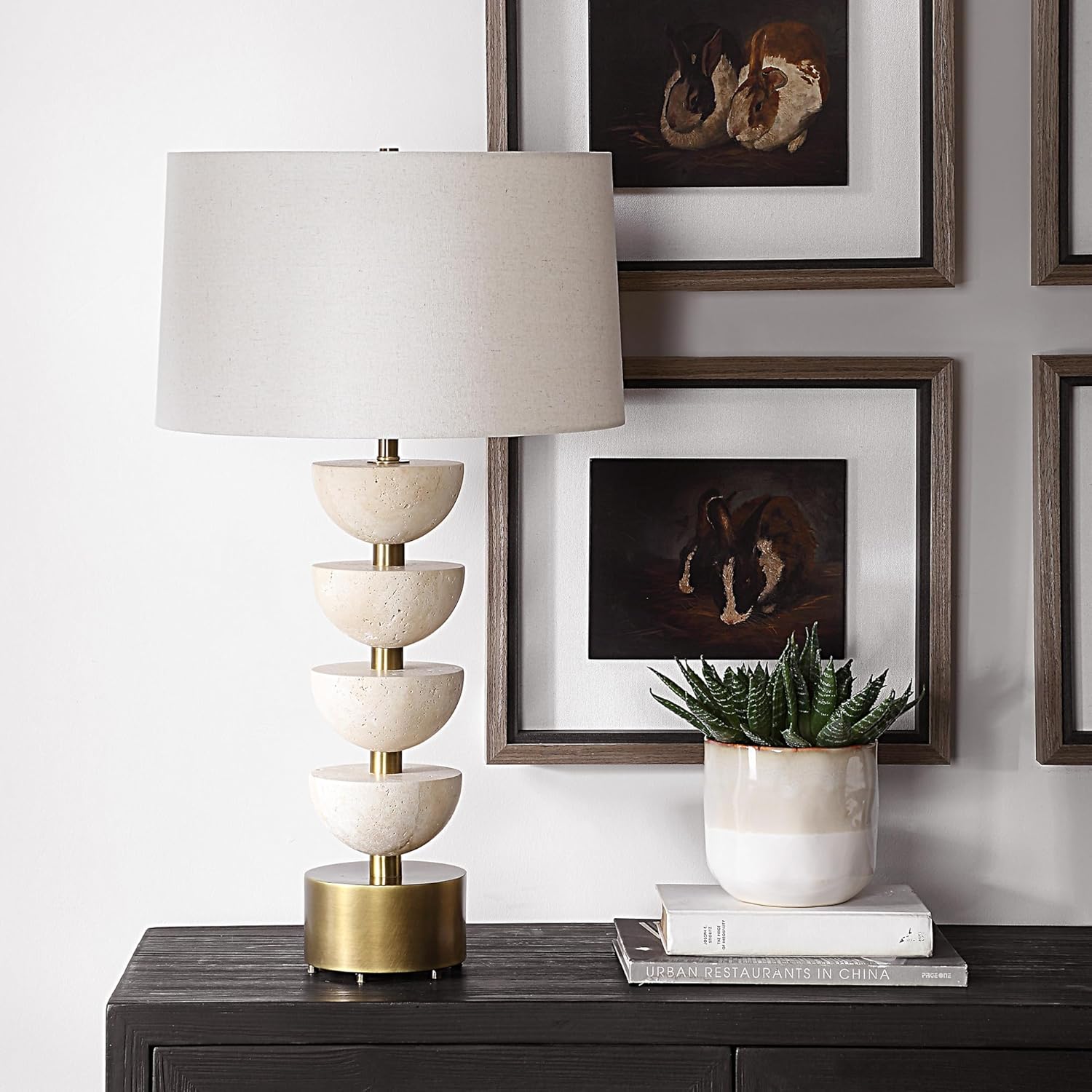 The Meridian Table Lamp features stacked travertine half-spheres on a central plated brass base with a matching foot. The slightly tapered round hardback shade is finished in an off-white linen fabric with light slubbing. 31″H, SHADE 10H X 17 Dia. (in)