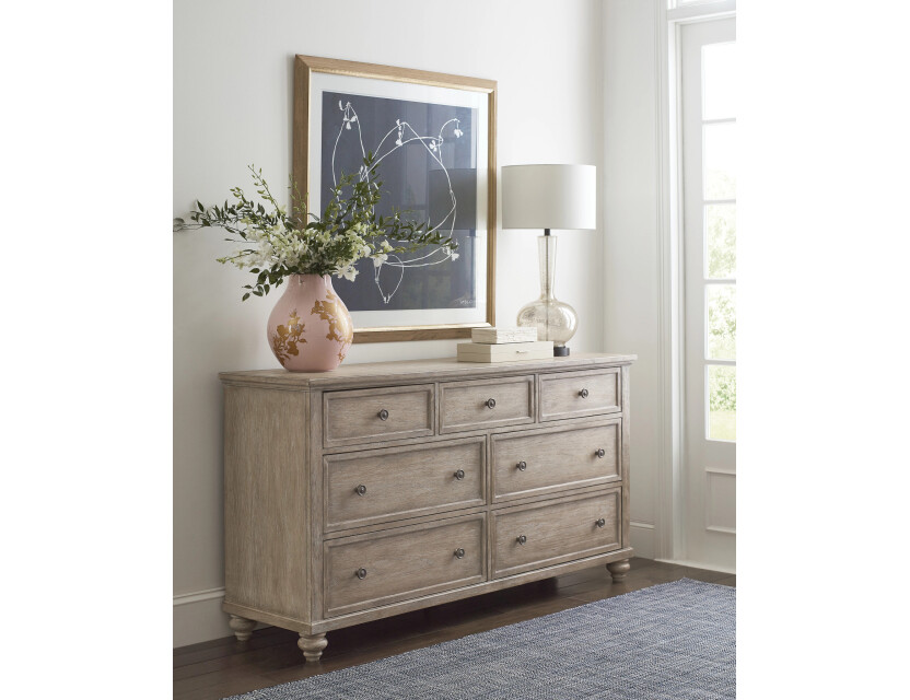 Gracefully shaped lines bring together classic European motifs in a feminine form and create a beautiful stage for two exquisite finishes. From hand-painted artwork to textural finishing techniques, and cerused glazes within the wood grain, this collection is as thoughtfully orchestrated as the homes it is intended for. Expertly crafted of white oak veneers and select solids in a Breve finish, this dresser offers plenty of storage with its seven drawers. It features a center foot for stability and adjustable levelers integrated into each foot to level the case. 36x68x19″