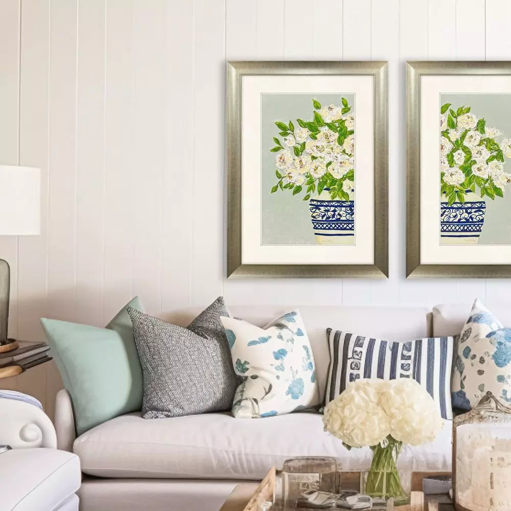 A jubilant floral arrangement is enhanced with hand painted touches and a raised premium linen-look mat. Framed in a champagne gold finish moulding.