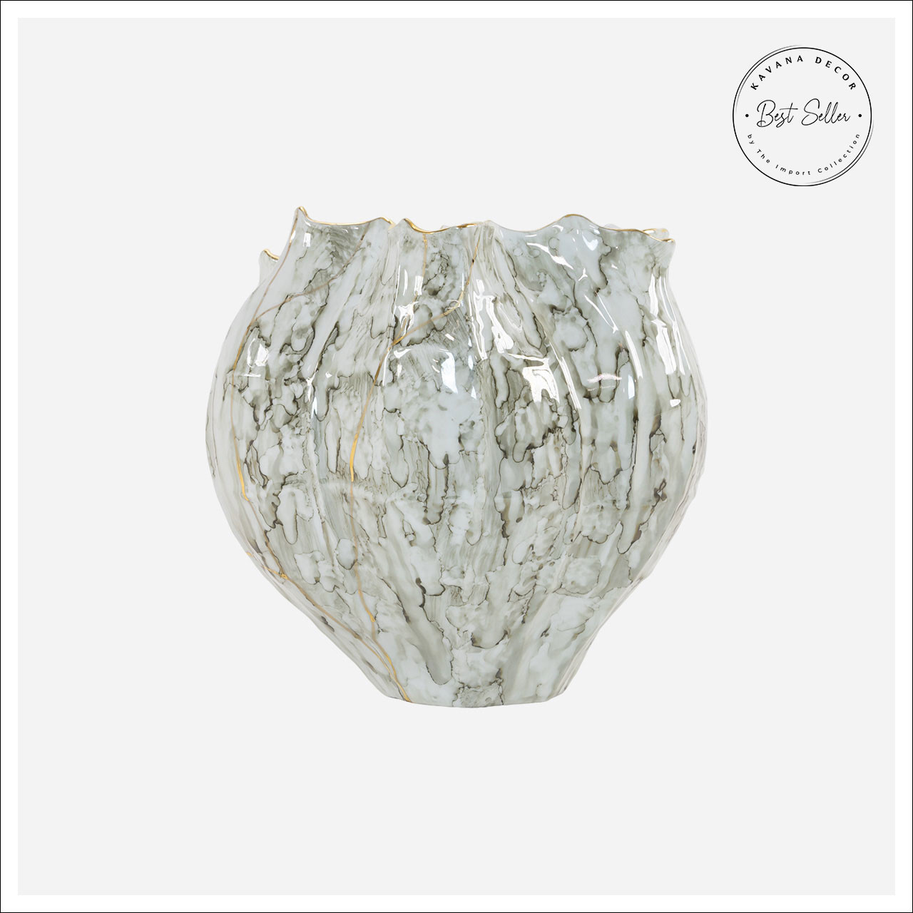 The Carmine Short Vase captivates with its sculptural elegance, bringing artistic flair to any modern interior. Meticulously crafted from premium porcelain, this luxurious 11.0 x 10.5H inch statement piece features a striking organic silhouette with uniquely pinched-in sides that create visual intrigue. The multicolored surface showcases exquisite gold and gray veining against a luminous white background, adding sophisticated texture to console tables, shelving, or dining room centerpieces. Perfect for both minimalist and maximalist design schemes, this versatile decorative accent works beautifully as a standalone art object or functional flower vessel. The Carmine’s contemporary shape and neutral yet distinctive color palette effortlessly complements various home decor styles from contemporary to transitional, making it an essential luxury accent for discerning interior design enthusiasts.