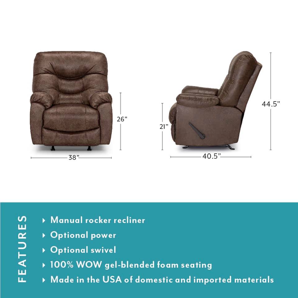 The 4295 Trilogy Rocker Recliner delivers a trilogy of comfort, support, and relaxation. Its cradle-back design contours perfectly to your body, providing an exceptional lounging experience. This power rocker recliner offers smooth, effortless operation, while our WOW Seating System combines precision-cut wood frames with gel-blended foam seating for unmatched comfort and durability. Built to support up to 275 lbs., the Trilogy is the perfect choice for relaxing in style—because great things come in threes!
