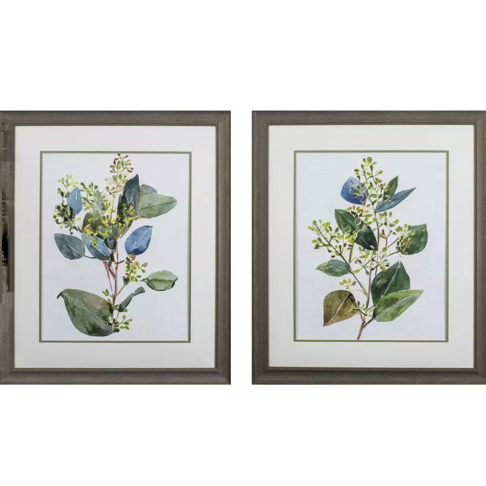 A set of botanical leaf images that have been double matted and framed under glass in a complimenting wood toned moulding.