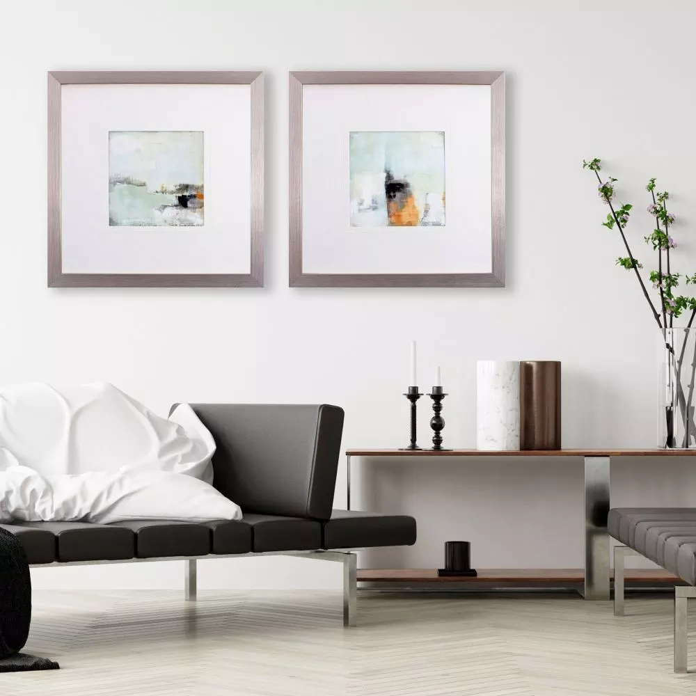 A set of two abstract prints are matted in white. Framed in an elegant contemporary moulding in a brushed silver finish with black lip.