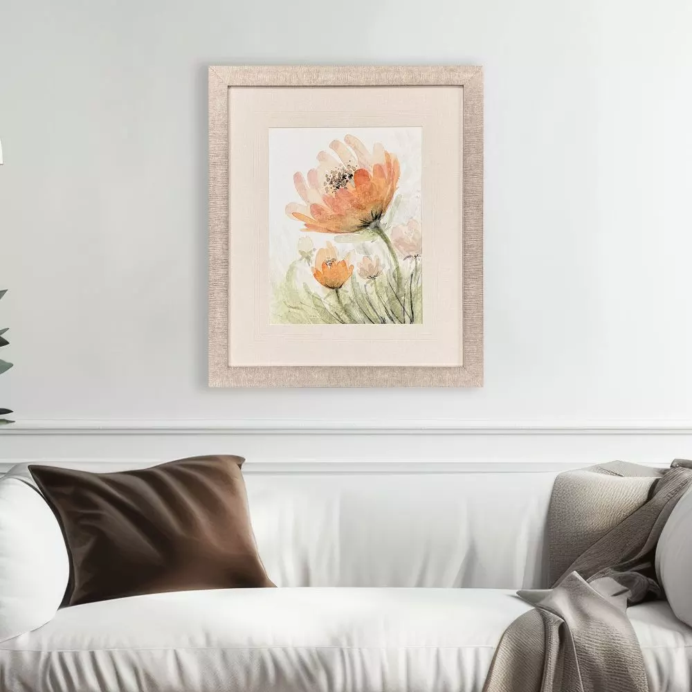 Beautiful poppies feature premium matting and v-groove details. Framed in a flat profile champagne gold finish with antique distressing.