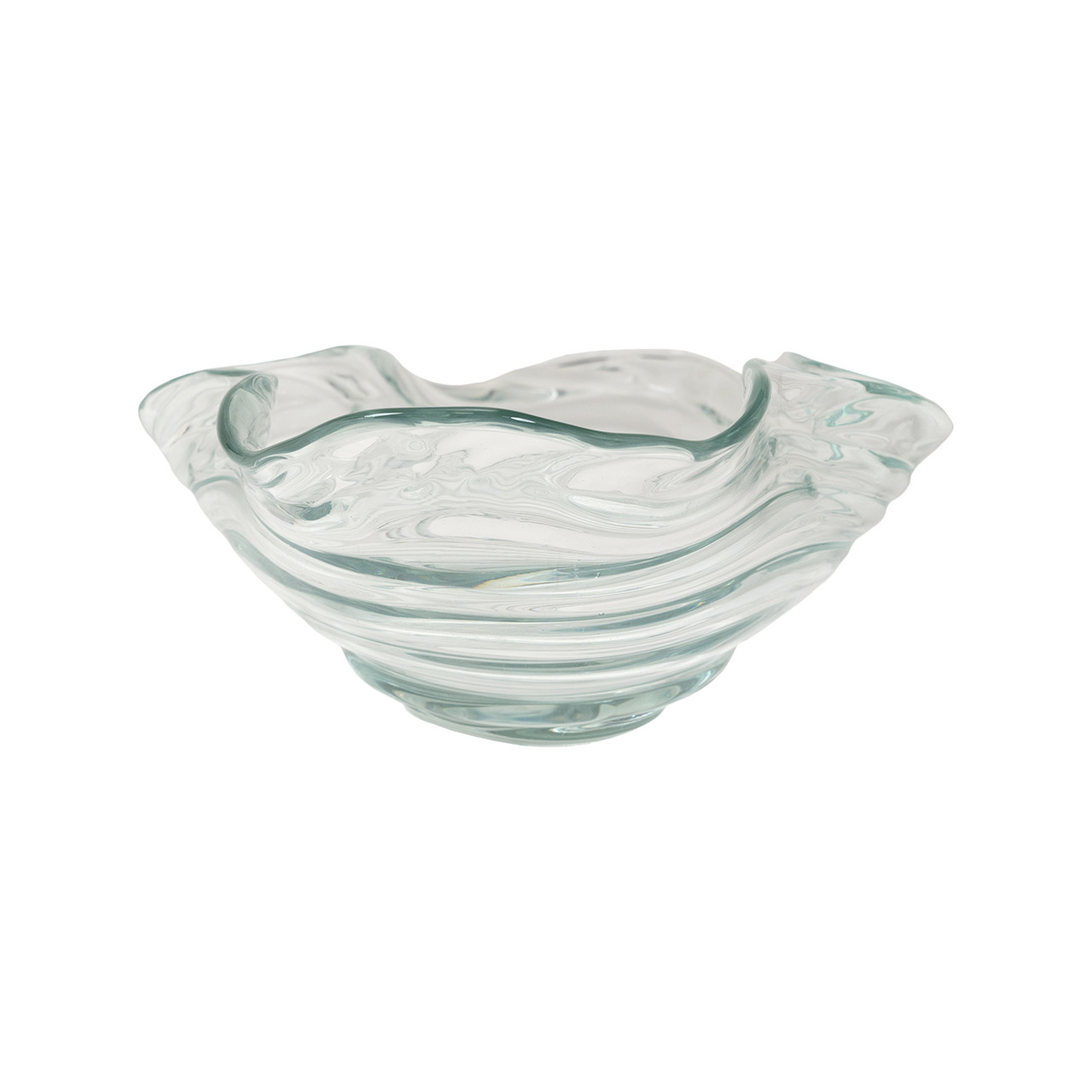 The Preslan Bowl showcases artisanal craftsmanship with its fluid, wave-inspired design that captures light beautifully across any surface. This premium clear art glass decorative accent piece measures a substantial 23L x 12W x 6.5H inches, making it an ideal centerpiece for elegant dining tables, console displays, or sophisticated office environments. The transparent glass reveals mesmerizing organic contours reminiscent of natural water formations, while its sculptural silhouette adds dimensional interest to contemporary and traditional decor schemes alike. Professional designers appreciate the versatility of this statement bowl for creating layered arrangements or as a standalone focal point in upscale residential, hospitality, or commercial projects. Each carefully curated piece brings distinctive texture and refined style to tabletop collections, enhancing interior design concepts with its artistic presence.
