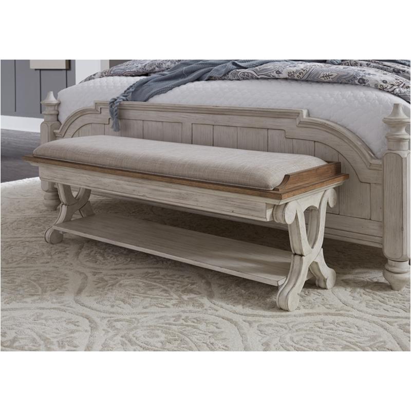 Complete your cottage look with this upholstered bed bench. The chestnut colored gallery top is accented by the beige polyester cushion. Decorative “X” end panels are highlighted by the antique white finish with heavy wire brush and distressing. Extra storage is added thanks to the bottom shelf. W52 x D18 x H19