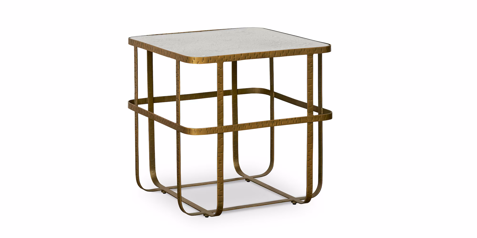 Dressed in gilded, Art Deco-like materials, the Atticus End Table offers fresh and functional glam to your living space. With enough tabletop surface to hold a lamp and sundries, the Atticus End Table is solidly functional. But its base of hand-forged, gold-finished, woven iron is an airy geometry of support. And the luminous reflections of its acid-etched, antiqued mirror top adds an ethereal quality to your entire room. From classic to transitional to modern, there’s not a space that the Atticus won’t fill with artful purpose. The Atticus Series also features a cocktail table.