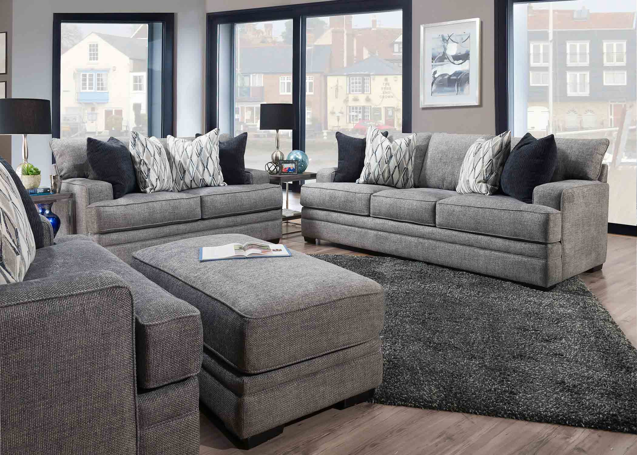The Juno stationary collection features a transitional style in Crosby Denim, a medium gray polyester fabric with accented throw pillows. This collection features coordinating accent pieces in Protege Slate.