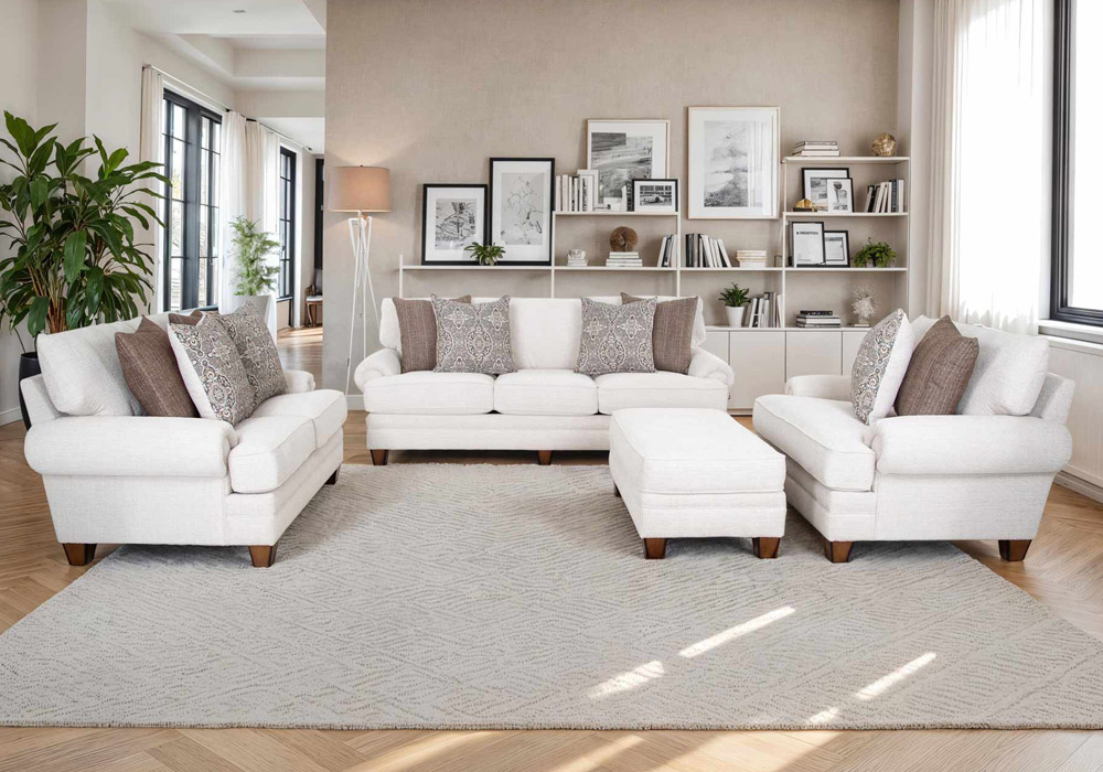 The 957 Redcliffe Collection is designed to bring inviting comfort and understated style to your living space. Upholstered in a soft, textured fabric with a light, creamy tone, Redcliffe offers a bright, relaxed look that feels calm and timeless. Coordinating throw pillows feature subtle patterning and warm neutral accents for an elevated yet approachable feel. Deep cushions and overstuffed backs invite you to sink in and unwind, while padded inset roll arms with gentle pleated detailing add a classic touch. Perfect for spacious living areas, the 957 Redcliffe creates a comfortable, welcoming atmosphere with effortless appeal.