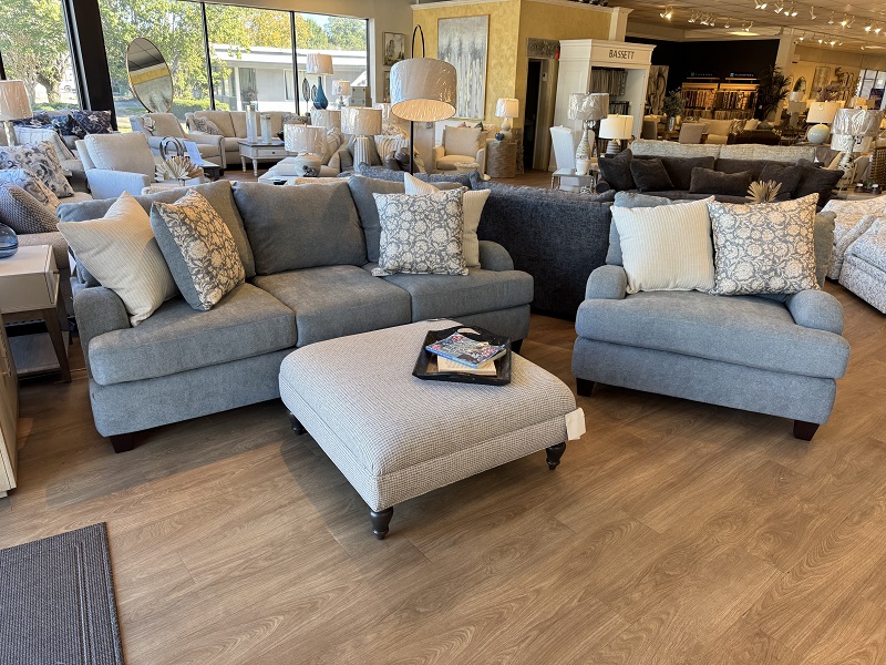 Timeless elegance meets everyday comfort in the 992 Laurel Collection. This inviting collection includes a sofa, loveseat, chair and a half, and a matching ottoman. All pieces upholstered in a durable gray-blue fabric. Coordinating throw pillows in timeless patterns and soothing hues enhance the aesthetic, adding a touch of warmth to the group. Solid wooden legs complete the look and offers support and a polished finish. 93” × 40.5” × 38″