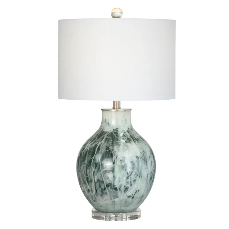The Gwen Table Lamp by Crestview Collection is crafted of blown glass with a reverse painted effect in a beautiful dripped glaze of azure and white. The color scheme is peaceful and serene and the crystal base adds just the right touch of sparkle.