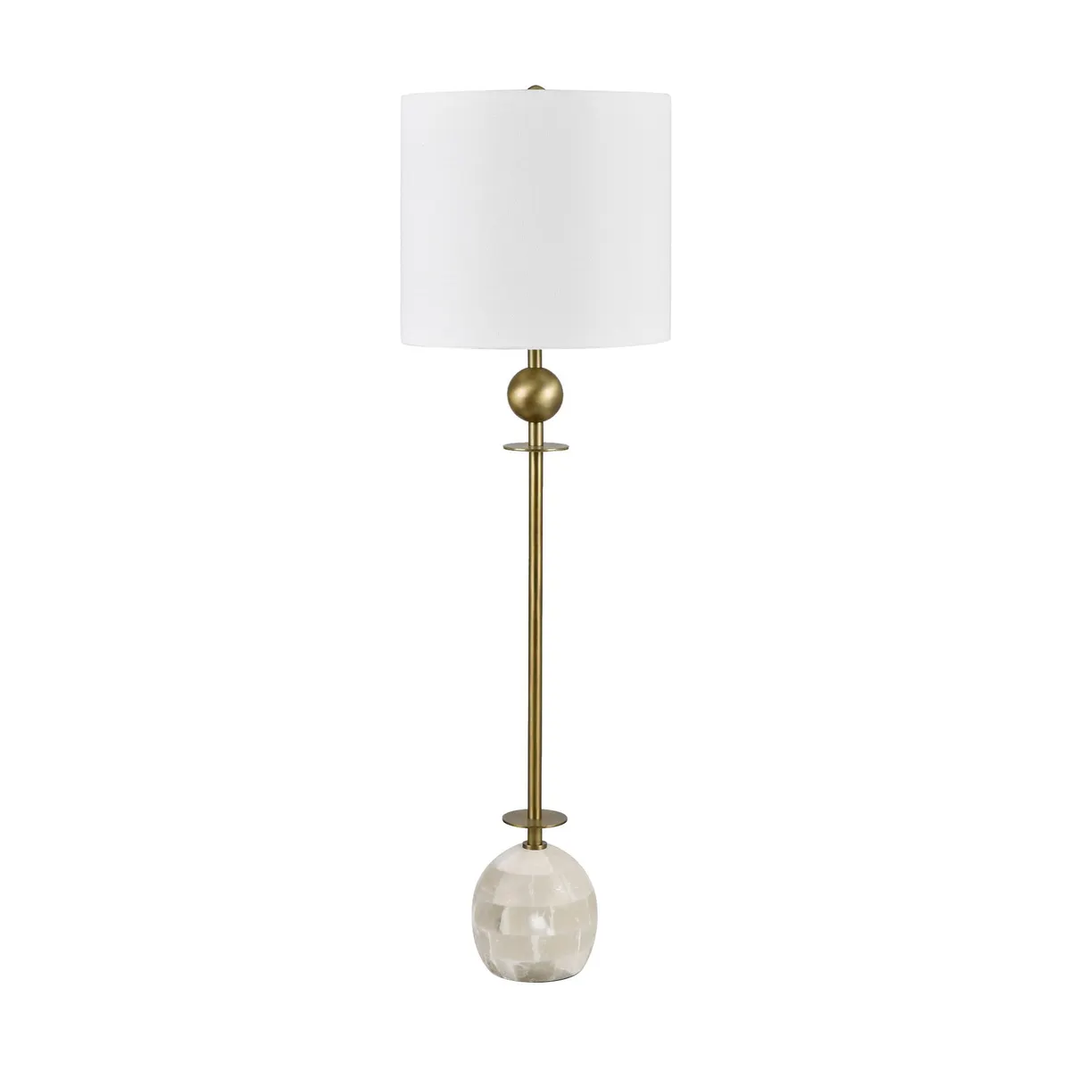 The Crestview Collection Camille Buffet Lamp exudes elegance with its slender design and tessellated alabaster block base. Soft gold accents complement the luxurious look, while the white linen shade adds a refined touch. Perfect for adding understated sophistication to any space.
