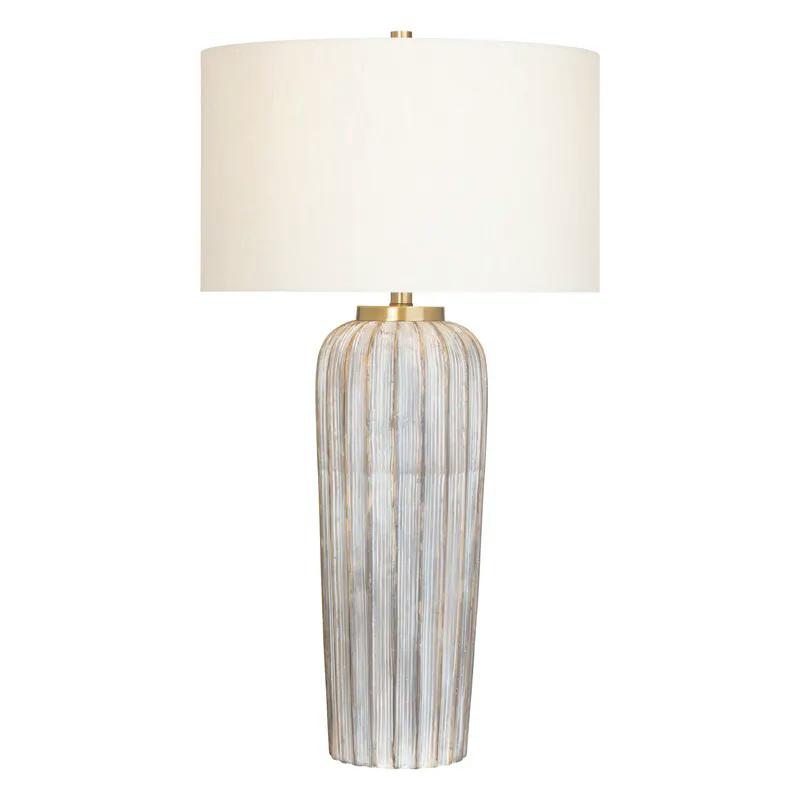 Crestview Collection’s Pascal Table Lamp is a large, dome-shaped ceramic body that features a fluted detail and a chalky hand finish. Varying shades of gray are softened with a whitewash. The natural linen shade further compliments the lamp’s overall subdued sophistication.