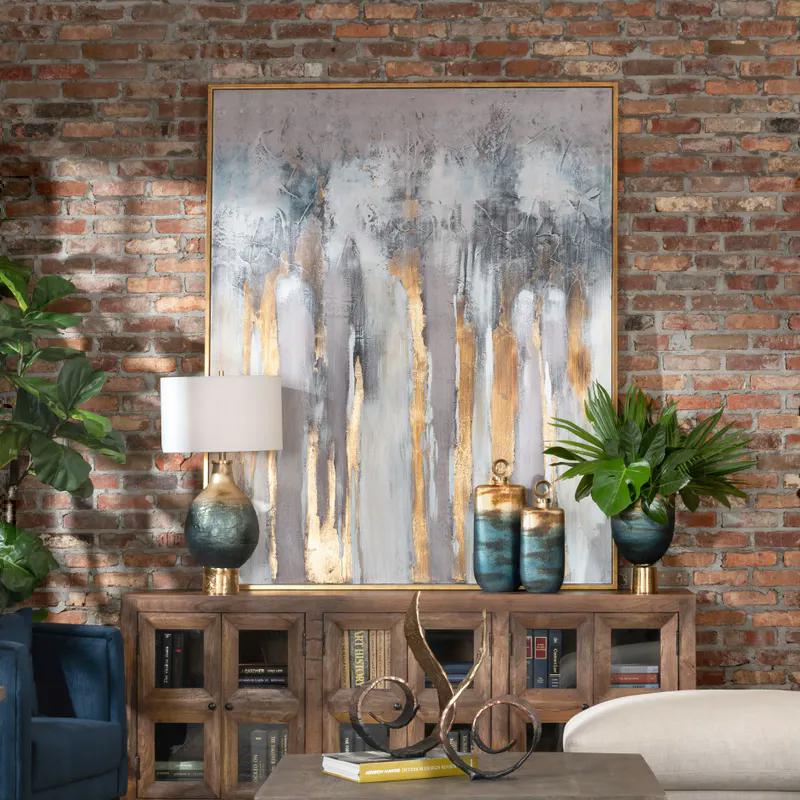 The Crestview Collection Haven framed painting on stretched canvas features cascading colors of gold, brown, blue and white. Measuring at 58-inches x 72-inches, this fashionable gallery-style art will fit with almost any modern style decor.