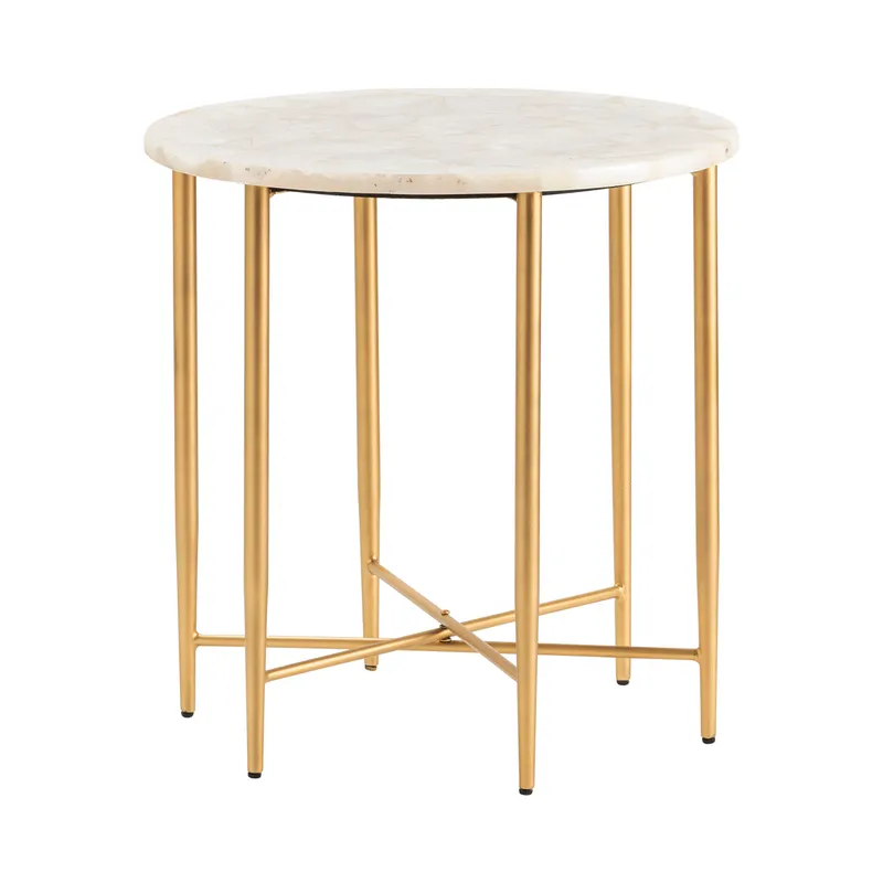 The Crestview Collection Katherine Round Accent Table features a clean, elegant look that will brighten up your home. This round, transitional accent table has six legs connected by an asterisk design in the middle. The gold finish of the metal legs complement the white marble table top that will beautifully support your favorite lamp or plant.