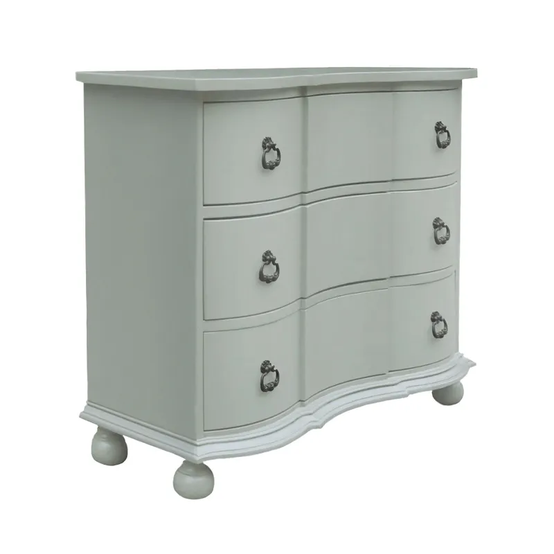 Add softness to the look of your space with this Crestview Collection Marissa Antique White Shaped 3-drawer Chest. The surface of this chest invites the eye with a smooth cream rubberwood finish with just enough distressing to evoke years of love. The curved drawer fronts add coziness to your decor and the twin metal drawer pulls finish off the classic styling that just feels like summer.