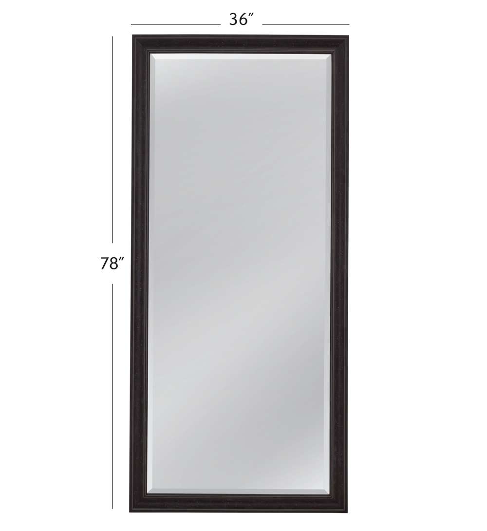The Mattern Floor Mirror features a tall rectangular silhouette with a stepped frame profile showcasing layered molding and mitered corners. The frame is finished in a distressed black tone. This mirror is constructed of resin and includes a beveled mirror.