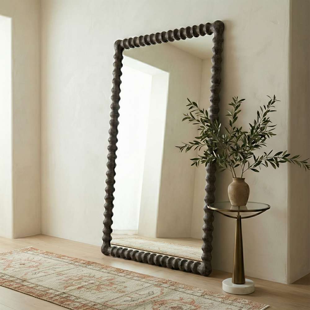 The Vallente Floor Mirror features a rectangular silhouette with rounded corners and turned spindle detailing along the frame. The frame is finished in a warm brown finish. This mirror is constructed with a solid wood frame.