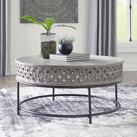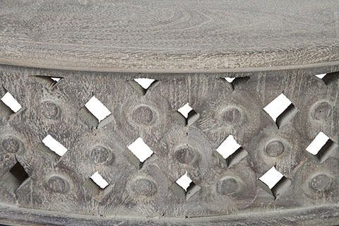 This round coffee table is reserved for those carving out a cool, eclectic aesthetic. Elements of this distinctive table crafted with India mango wood include hand-carved aprons forming an open lattice weave. Metal frame in matte black is a striking complement to the tabletop’s burnished gray finish.
